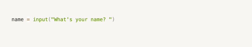 The input function displays a prompt (in this case, “What’s your name? “) and waits for the user to type something and press Enter. The user’s input is then stored in the variable name.