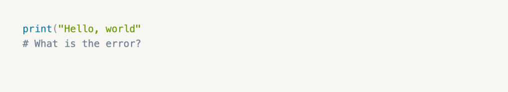 This code will raise a SyntaxError because it is missing a closing parenthesis ). These bugs can get more complicated, but understanding and resolving them is a crucial part of programming.